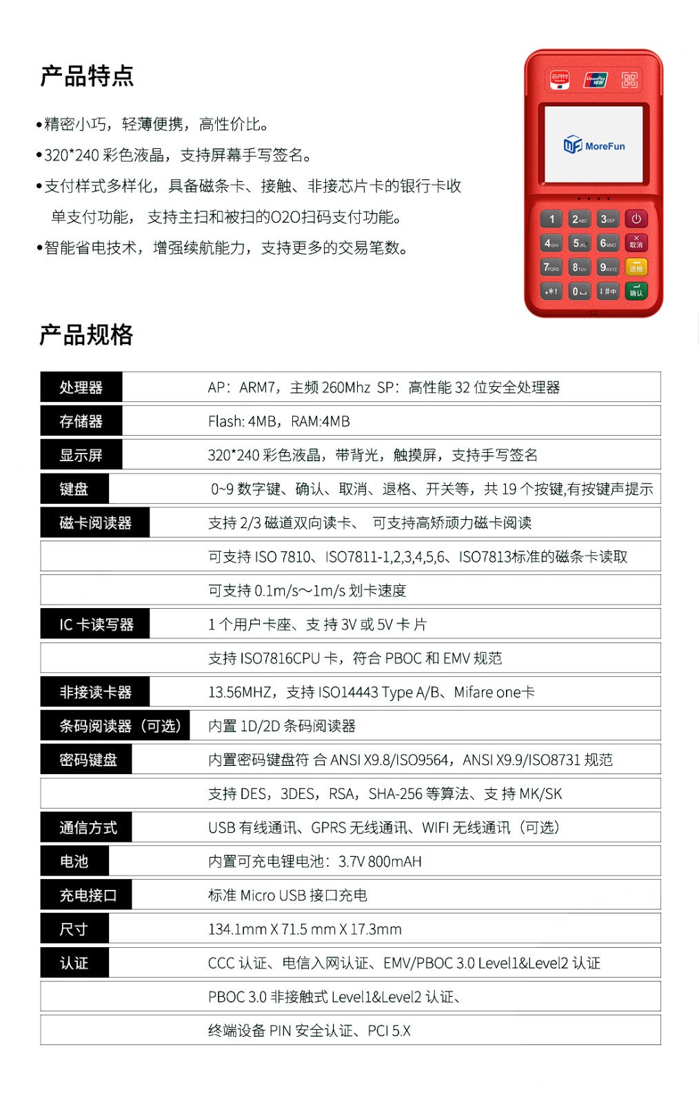 首页>>吉林产品中心>>吉林手持无线POS 吉林联动优势-优POS Pro 高配版 * 性能优越:32位高性能ARM11安全CPU;整机通过业内更先进的PCI PED4.X 安全认证及国内受理终端PIN输入设备安全评估检测认证,多项措施保障金融交易的安全;* 时尚外观:外形小巧携带方便,高抗跌落性能、宽工作温度、防水防尘设计、外壳坚固耐刮、户外携带式作业更加耐久可靠。* 通讯备份:支持2G-3G扩展;* 超长续航:3.7V-800毫安稳定续航能力,智能电池管理保证持续工作18小时,待机72小时。 标准配置 返 回